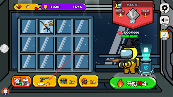 1、在游戏主页面,点击下方枪械购买按键,花费金币购买新的武器。