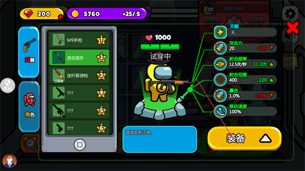 4、点击进入角色页面,可以更换武器进行装备,根据装备后的属性调整武器选择。