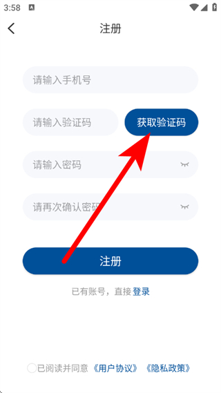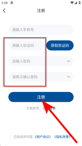 5、输入验证码、密码及确认密码,勾选后,点击注册,完成注册。
