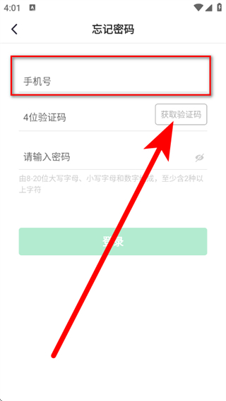 3、在忘记密码页面,输入手机号,点击获取验证码。