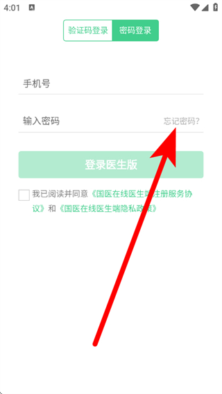 1、打开国医在线医生端,在登录页面,点击密码登录,进入页面。