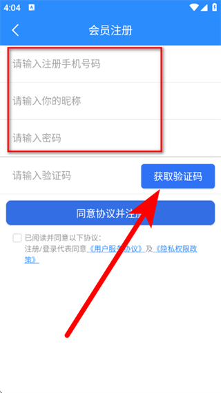 4、输入注册手机号码、昵称、密码后,点击获取验证码。
