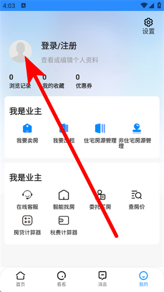 2、在我的页面,点击登录注册区域,进入登录页面。
