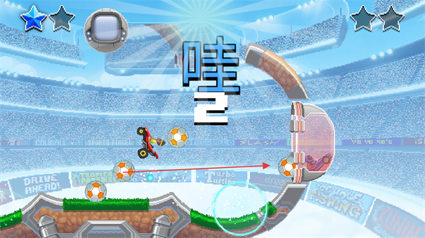 2、利用赛道上的弧形轨道和道具,调整赛车位置,精准撞击足球,增加射门成功率。