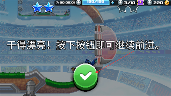 4、挑战完成后,按下绿色确认按钮,继续进行下一关的足球运动挑战。