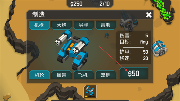 3、点击左下角的机甲选项,完成一些建筑的建设可以解锁机甲升级的条件,点击右下角花费50金币升级机轮。