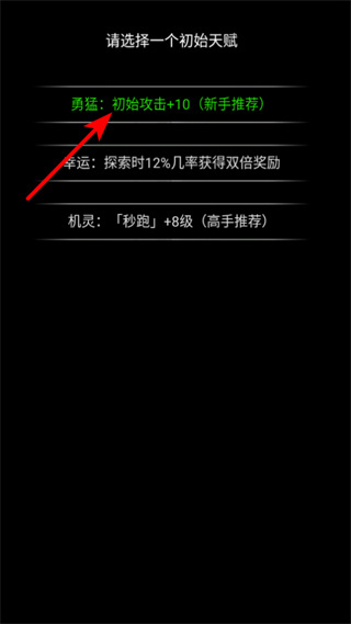 1、进入游戏后,选择勇猛初始攻击+10天赋,这是提升初始战力的关键选择,新手选择更轻松开展冒险。