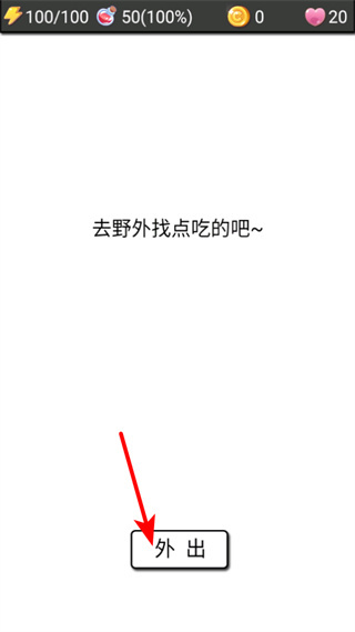 2、点击外出按钮,前往野外寻找食物,这是获取生存资源的基础操作,通过此操作开启野外探索进程。