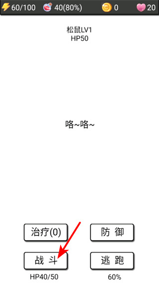 3、遇到松鼠等怪物时,点击战斗的按钮,可以发起攻击击败怪物,获取经验和资源,推进游戏的发展。