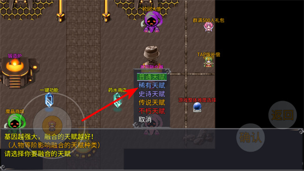 1、游戏中融合天赋时,选择稀有天赋等不同品质的天赋,天赋为角色带来更强战力,助力冒险。