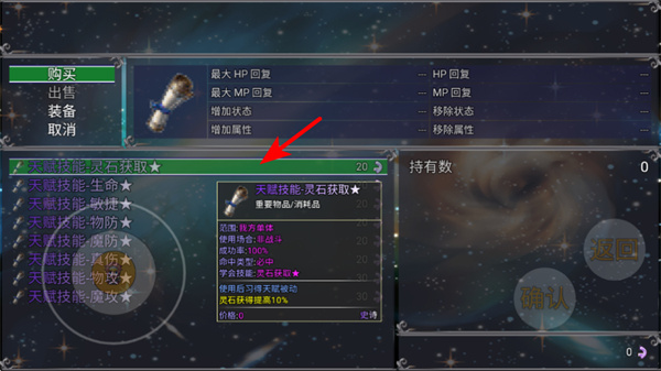 2、可购买天赋技能道具如灵石状识,使用后能获得天赋技能,提升角色能力,增强战斗优势。