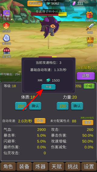 2、点击升级按钮,消耗资源提升自动攻速档位,攻速提升后可增加攻击频率,提升打怪效率。