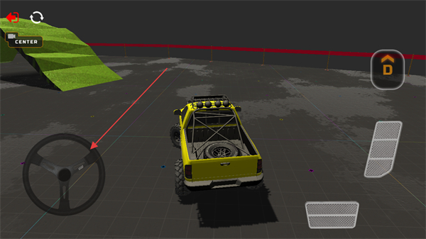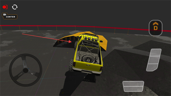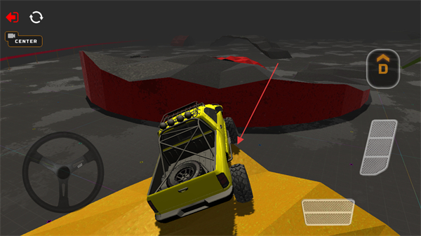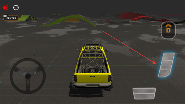 1、点击油门踏板加速,操控黄色越野车在地形复杂的赛道行驶,开启越野挑战。