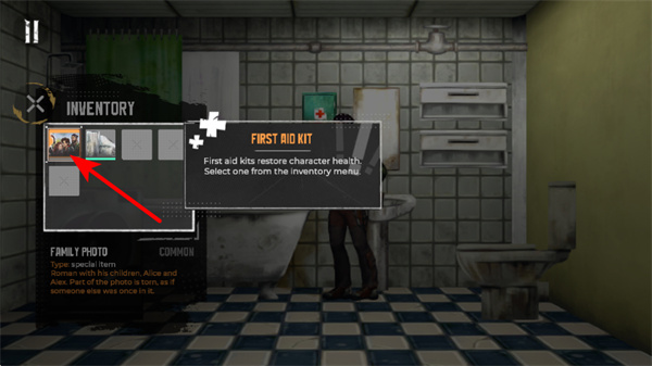 1、在物品栏中找到急救包,它可恢复角色生命值,需从物品栏菜单中选择使用,这是保障角色生存的关键操作。