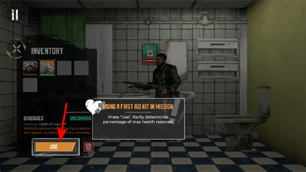 2、使用急救包时,点击USE按钮,其稀有度决定恢复的最大生命值百分比,合理使用可有效提升角色续航能力。