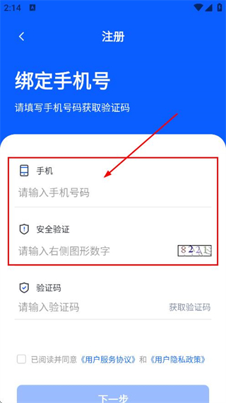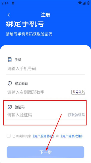 3、输入验证码,勾选已阅读并同意后点击下一步,继续完成注册操作。