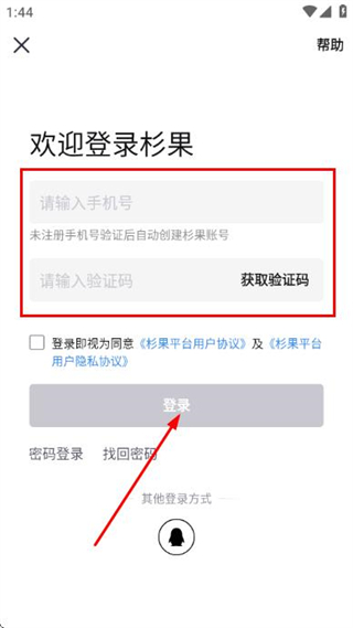 3、在登录页面填写手机号对应的内容,点击获取并填写验证码,勾选协议后,点击登录完成账号登录操作。