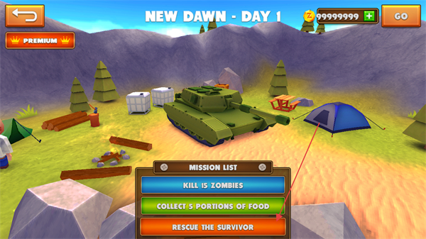 1、在NEWDAWN-DAY1场景中,驾驶坦克完成击杀僵尸、收集食物、营救幸存者等任务。