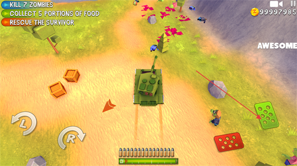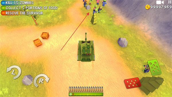 2、操控坦克行驶,遇到僵尸群时发起攻击,消灭僵尸推进任务进度。