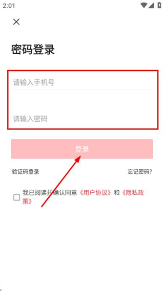 3、在密码登录页面填写手机号和密码,勾选协议后,点击登录完成账号登录操作。