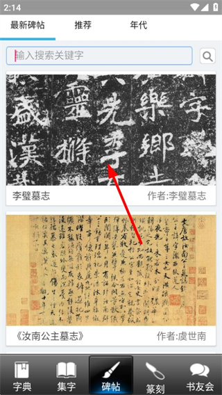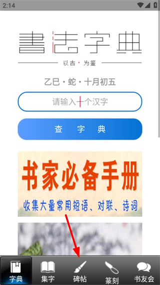 1、在书法大观首页,点击底部导航栏的碑帖选项,可进入碑帖展示页面。