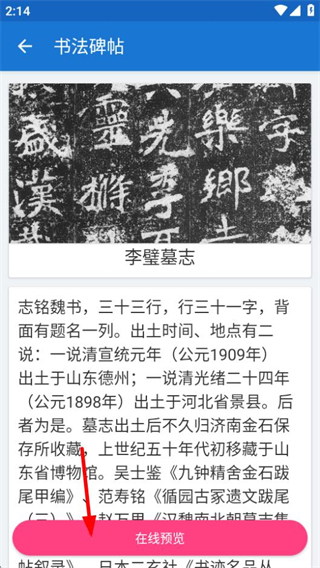 3、在碑帖详情页面,点击在线预览按钮,可查看该碑帖的完整内容。