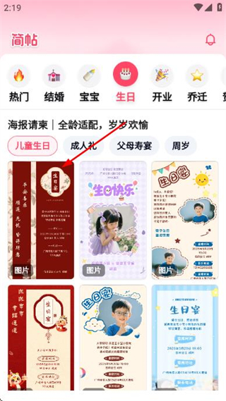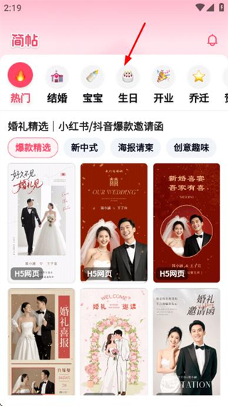 1、在简帖首页点击生日分类,进入生日请柬的模板列表页面。