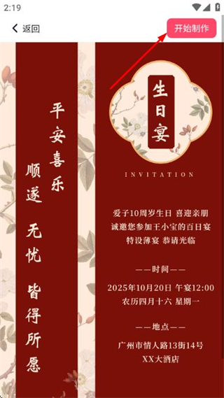 3、在模板详情页面点击开始制作,进入请柬的编辑页面。