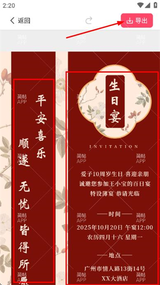 4、在编辑界面编辑文字内容完成后点击导出,完成生日请柬的制作。