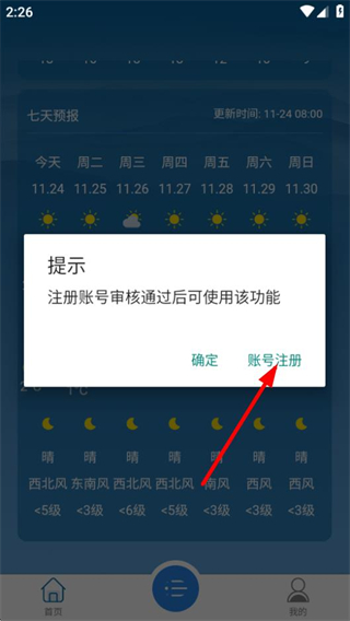 2、在提示弹窗中,点击账号注册选项,可进入登录注册页面。