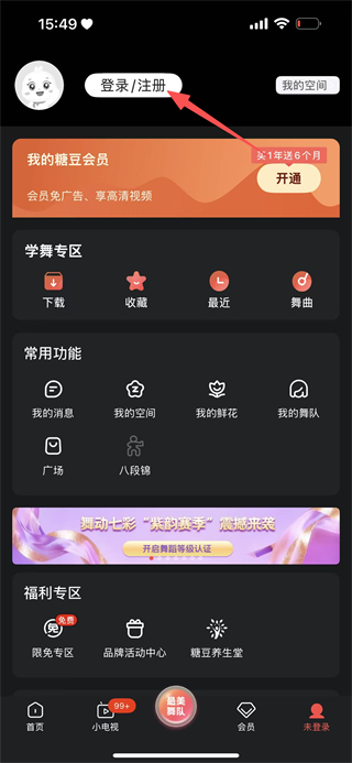 2、在个人中心页面,点击登录/注册,进入登录选择界面。