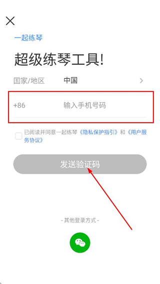 2、在登录界面,输入手机号码,点击发送验证码,进行下一步。