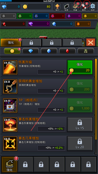 4、进入强化界面,消耗金币强化伤害升级等属性,提升炮塔的伤害、金币获取等能力,更好地应对后续敌人。