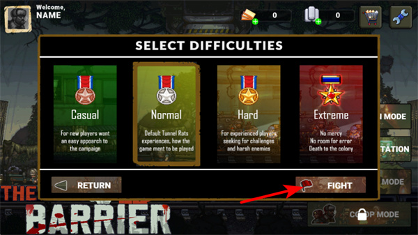 1、选择难度并点击FIGHT按钮,可开启游戏战斗,这是进入游戏的关键操作,选择难度获得对应游戏体验。