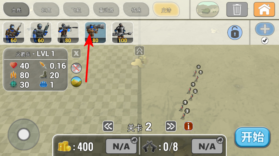 1、在部队选择界面,点击火箭兵可将其编入己方部队,该兵种具备远程攻击能力,是压制敌方步兵的有效单位。