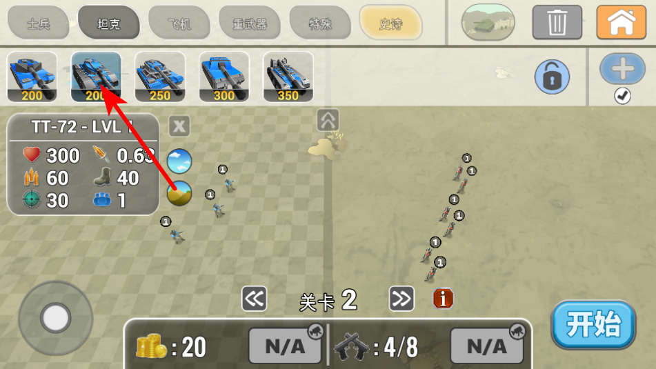 3、在部队选择界面,点击TT-72坦克可将其加入阵容,坦克具备高血量和输出能力,能有效抗伤并打击敌方单位。