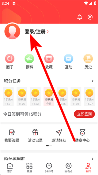 2、在我的页面,点击登录注册区域,进入登录页面。