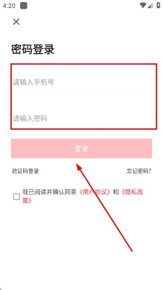 3、在密码登录页面填写手机号和密码,勾选协议后,点击登录完成账号登录操作。