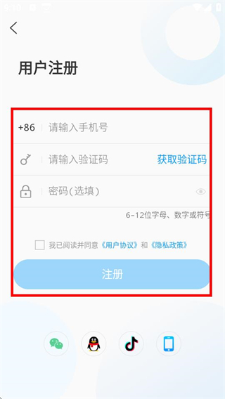 4、在用户注册页面,填写信息并勾选协议后,点击注册即可完成注册。