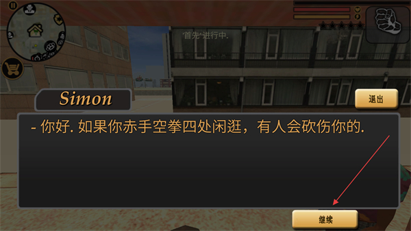 1、遇到Simon这类NPC时,点击对话窗口的继续按钮查看完整提示,可获取行动警告,同时得到后续任务的相关指引。