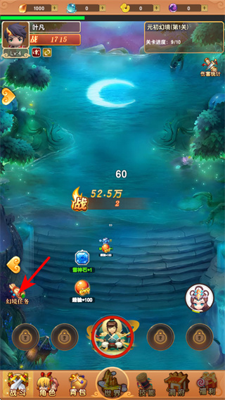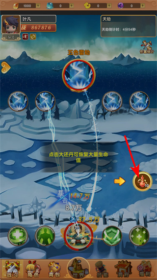 1、战斗中点击红色箭头指向的丹药按钮,可快速恢复大量生命值,这是保障角色生存,血量不足时及时使用。