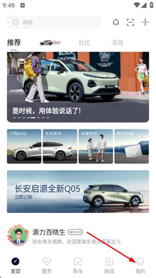 1、在长安启源发现页面点击底部我的,进入我的页面。