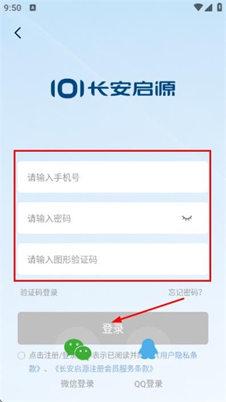 3、在登录页面填写手机号、密码、图形验证码对应的内容,勾选相关协议后点击登录完成账号登录操作。
