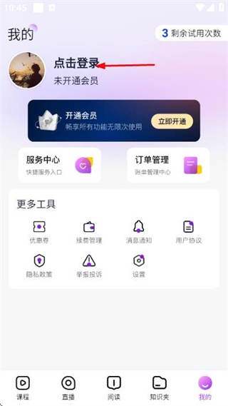 1、在课程页面点击底部我的,进入我的页面。