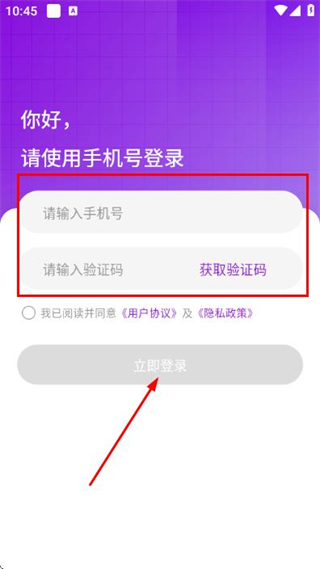 3、在登录页面填写手机号,获取并填写验证码,勾选协议后,点击立即登录完成账号登录操作。