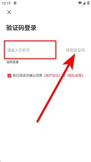 3、在验证码登录页面,输入手机号,勾选协议后,点击获取验证码。