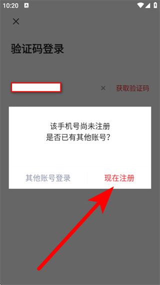 4、在弹出的该手机号尚未注册提示框中,点击现在注册。