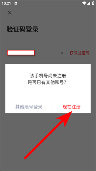 4、在弹出的该手机号尚未注册提示框中,点击现在注册。