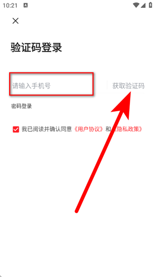 3、在验证码登录页面,输入手机号,勾选后,点击获取验证码。