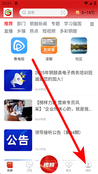 1、打开今日铜鼓,点击底部我的,进入我的页面。
